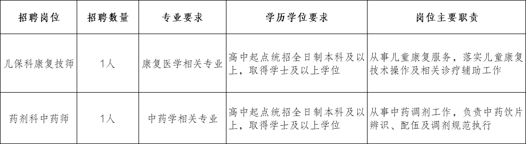4.资格证书:儿保科康复技师岗位提交康复治疗师资格证,药剂科中药师岗位如有相关从业证书可一并提交。