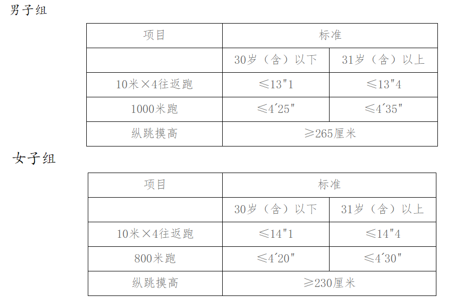 备注:年龄计算时间截至到参加体能测试当月。10米×4往返跑每人最多可测2次,男子1000米跑/女子800米跑每人最多可测1次,纵跳摸高最多可测3次。