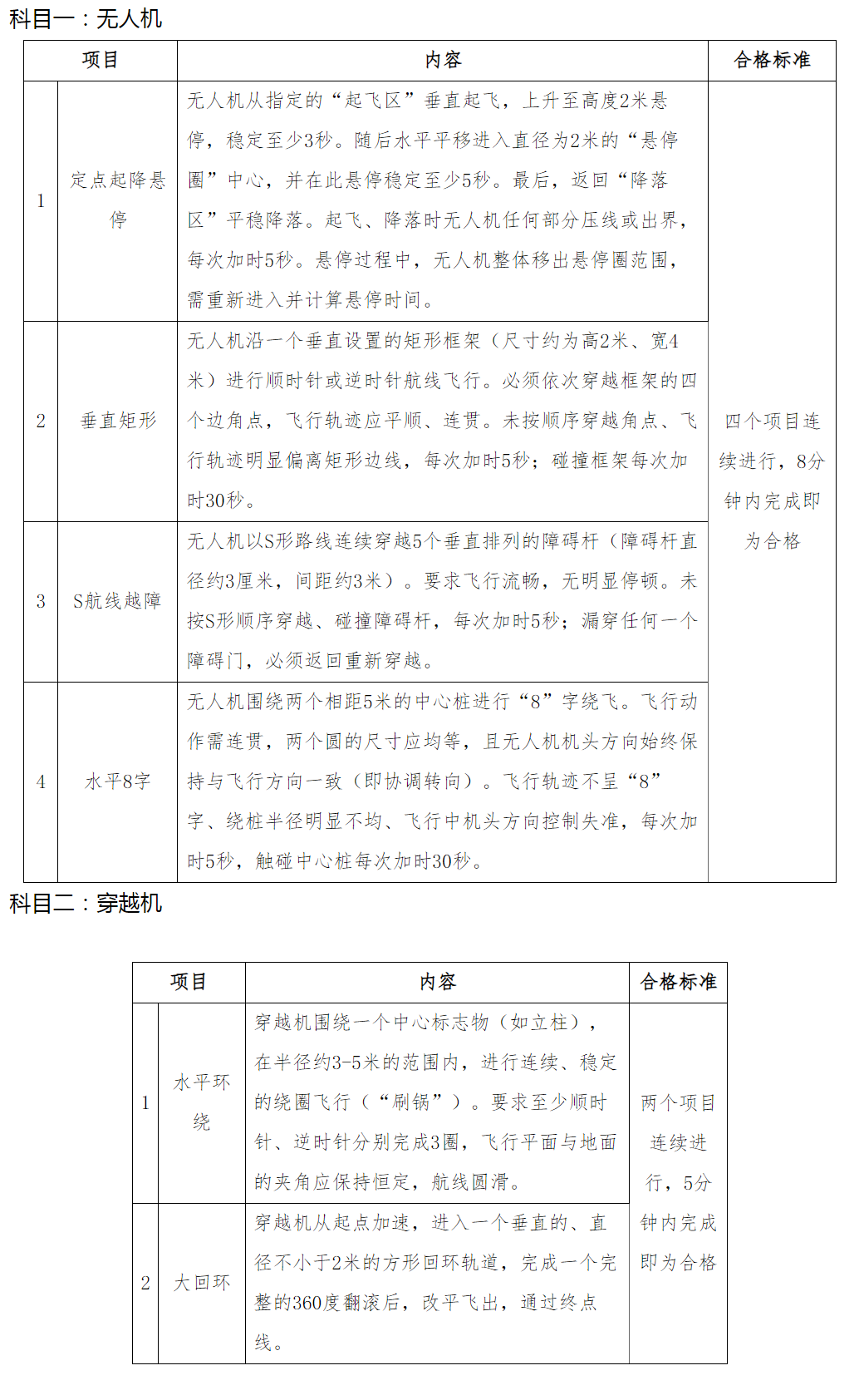 (2)专业科目测试标准:参考中国民用航空局2024年印发的《民用无人驾驶航空器操控员执照考试管理办法》,主要考察应聘人员是否熟练掌握无人机或穿越机起飞、悬停、水平环绕、八字环绕等基础操控技能。具体标准如下: