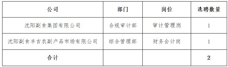 沈阳副食集团是沈阳市国资委出资的大型国有流通企业集团,是市管国有重要骨干企业之一,是沈阳市人民政府菜篮子工程的重要载体。为进一步加大人才公开选拔力度,拓宽选人、用人渠道,根据工作需要,面向集团内外部社会化招聘企业人才。