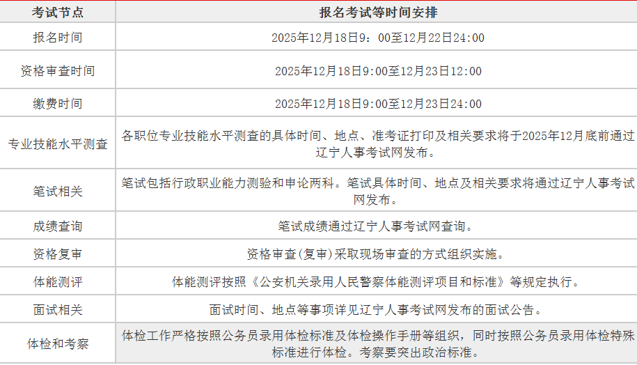 2026年度辽宁省公安机关特殊职位考试录用公务员时间安排表摘要